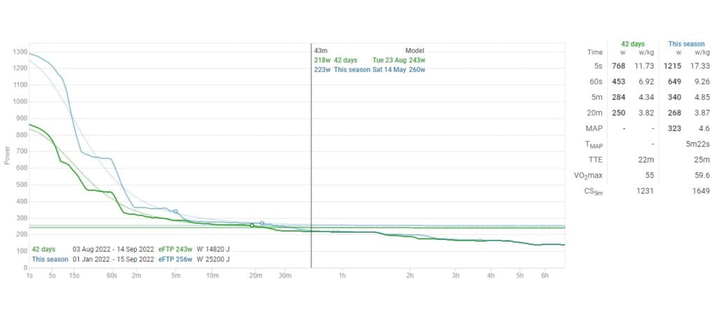 También existen otros métodos como los del cálculo de potencia critica (PC) una métrica similar al FTP pero que se calcula estudiando la relación de dos o tres pruebas contrarreloj máximas de más de 3 minutos ya que la pérdida de potencia al alargar la duración presenta una relación perfectamente hiperbólica. Con este método se define la PC como la potencia teórica de que dadas las condiciones ideales se podría aguantar indefinidamente en el tiempo. Y también aparece la W’ que es la cantidad de energía que se puede gastar una vez que se genera una potencia superior a la PC. Por tanto, según este modelo tanto si estás generando una potencia 20W superior al FTP como si se 200W superior la cantidad de KJ (potencia*tiempo) será la misma, la diferencia es que a 200W por encima de la PC se gastan más rápido y por tanto, se dura menos.
